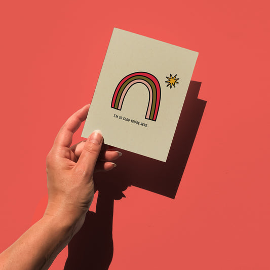 I'm so glad you're here. Digitally printed greeting card.